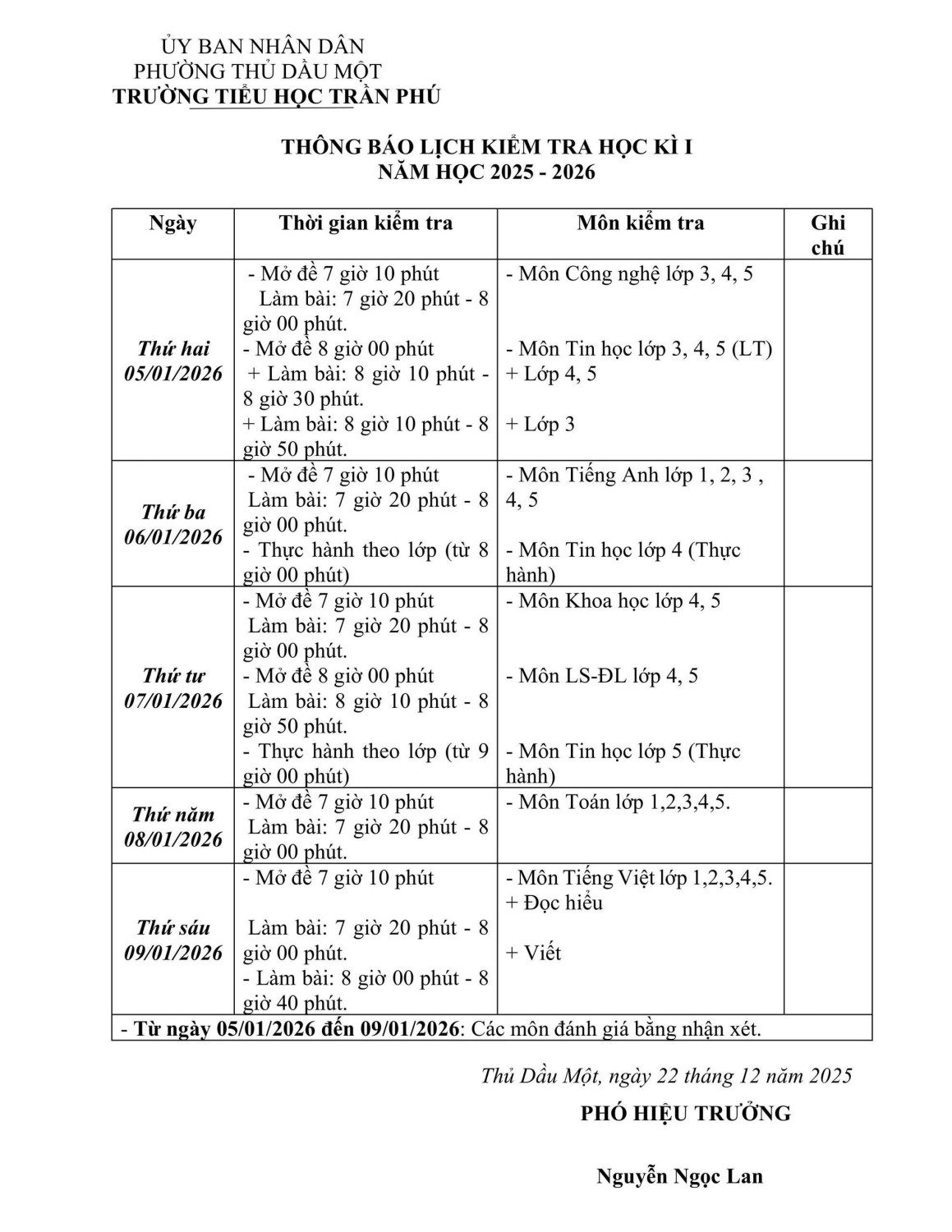 Lịch kiểm tra học kì I năm học 2025 - 2026