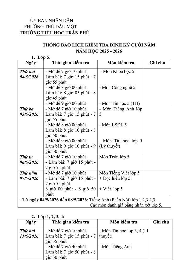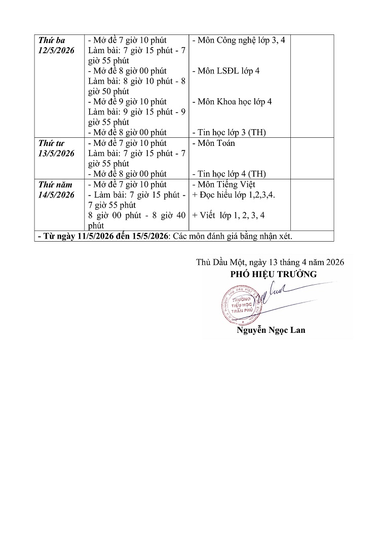Lịch kiểm tra học kì II năm học 2025 - 2026