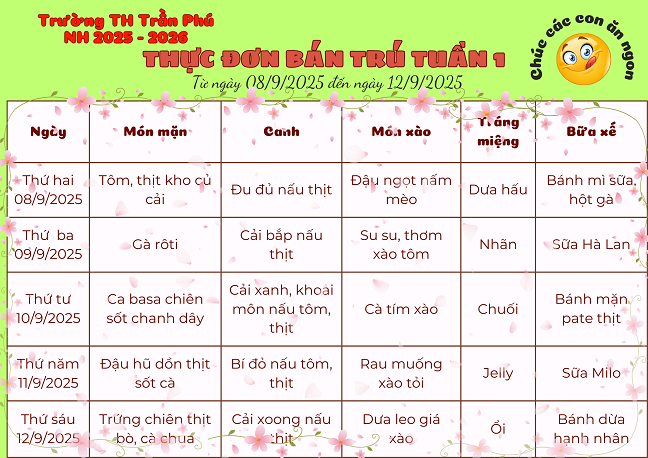 Thực đơn bán trú tuần 1 - Năm học 2025 - 2026