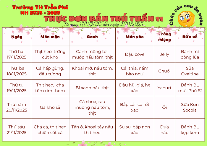 Thực đơn bán trú tuần 11 - Năm học 2025 - 2026