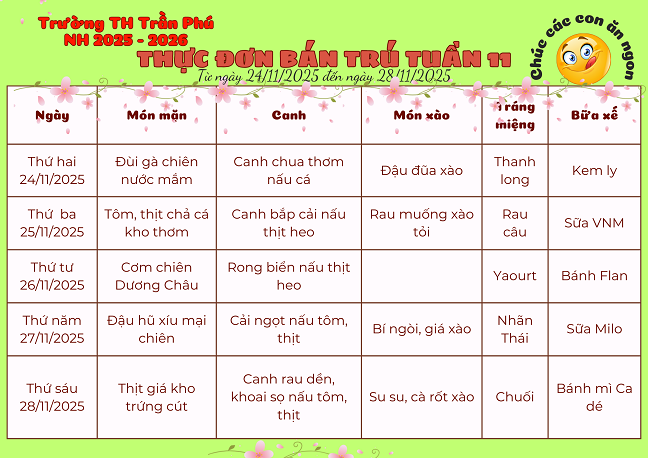 Thực đơn bán trú tuần 12 - Năm học 2025 - 2026