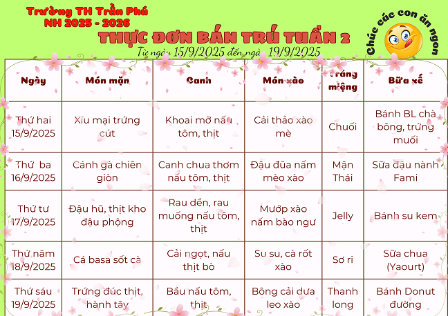 Thực đơn bán trú tuần 2 - Năm học 2025 - 2026