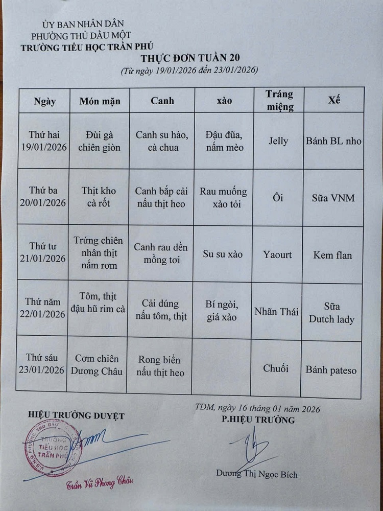 Thực đơn bán trú tuần 20 - Năm học 2025 - 2026